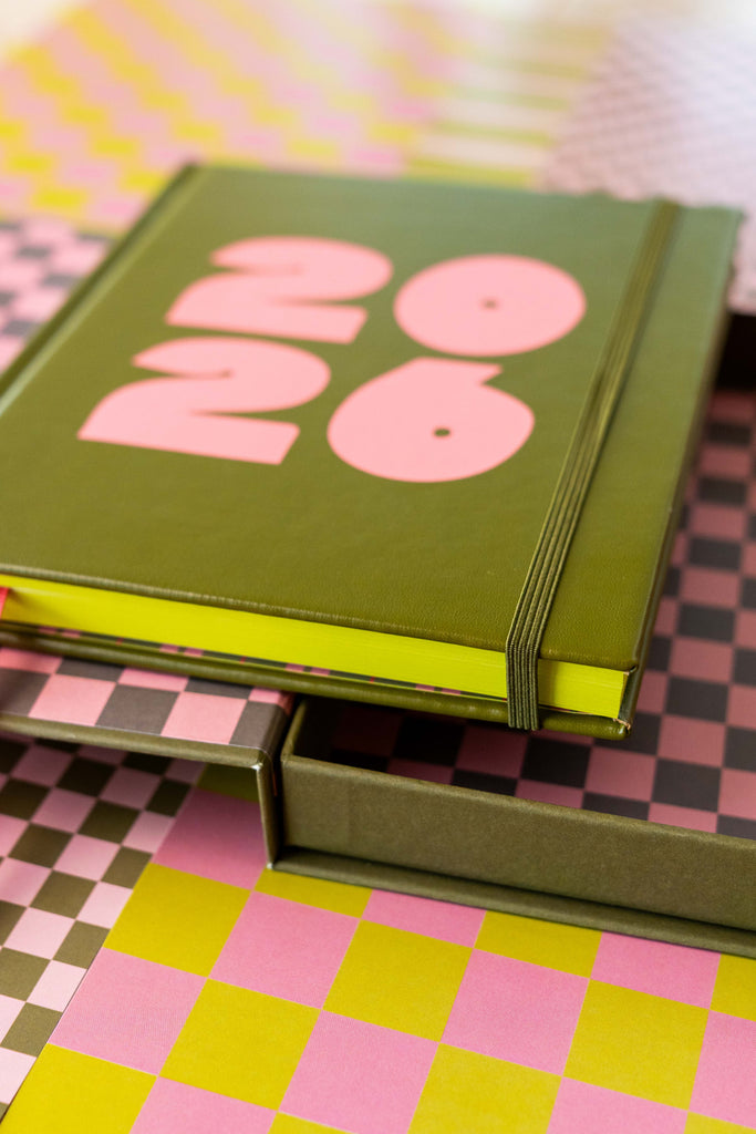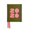 This 2026 Australian diary has an olive green vegan leather cover with coral pink embossed '2026' and an olive green elastic band