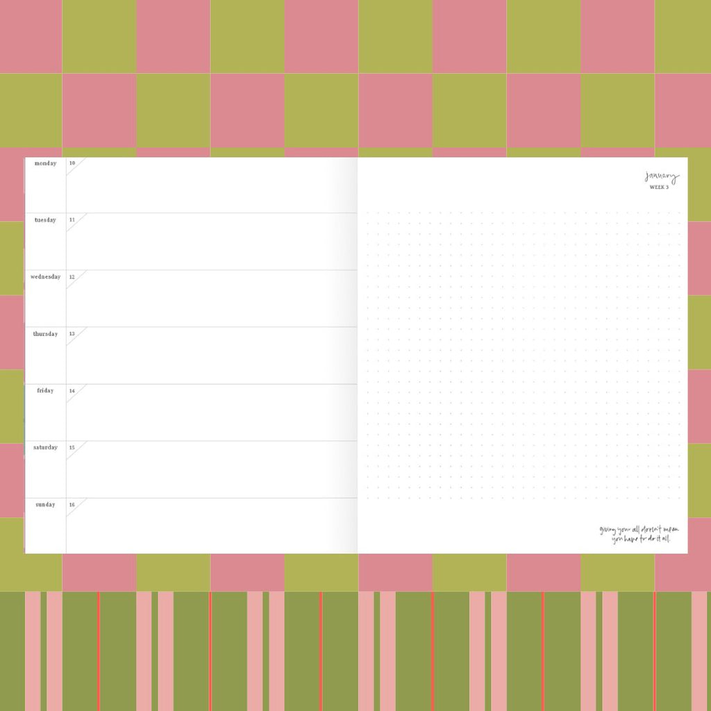 Featuring a horizontal weekly page layout on the left, and a dot grid note page on the right for making notes/ doodling / stretching out!