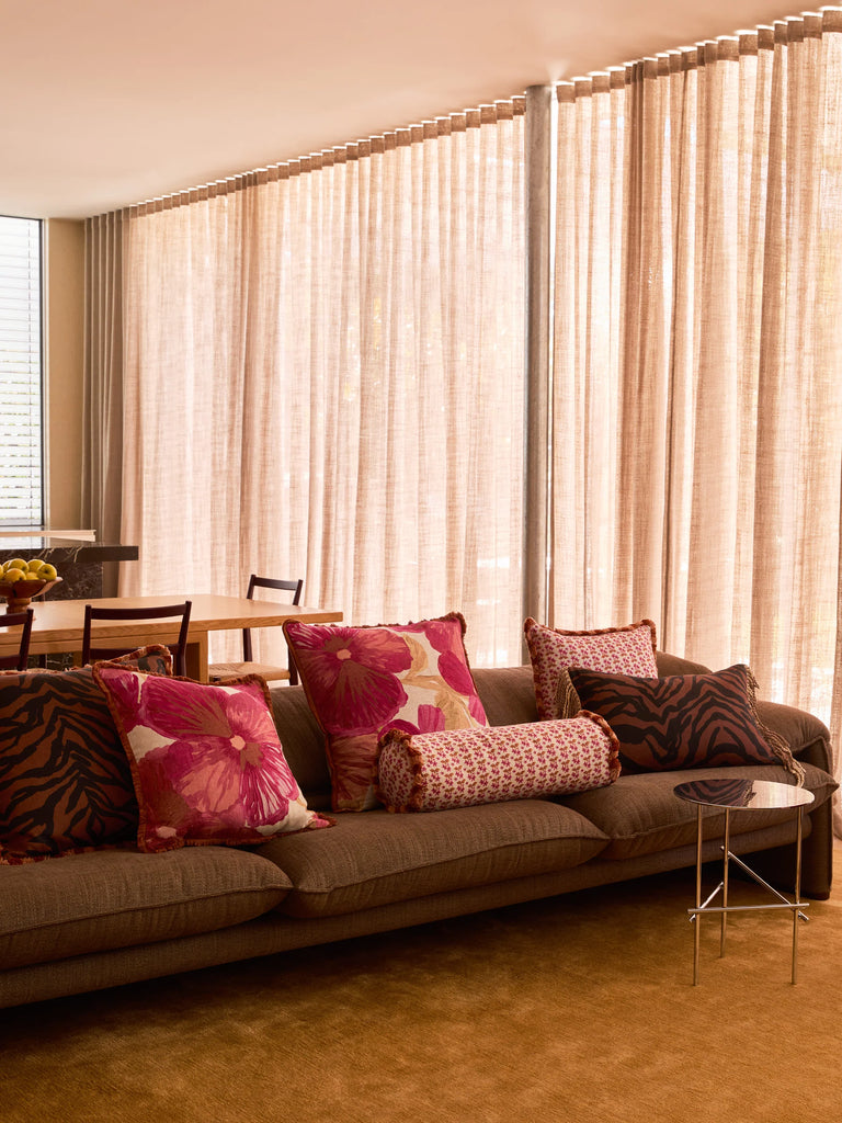 A confident pattern finished with a two-tone fringe, this cushion adds richness and visual weight to layered interiors