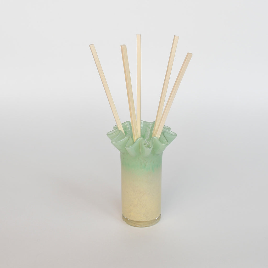 Sculptural glass jar with reed diffuser sticks and oil refill