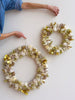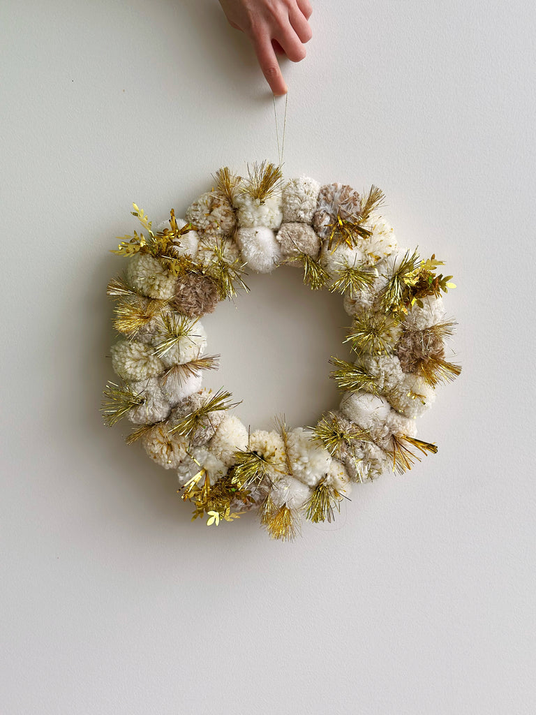 Hanging wreath covered in handmade natural and gold pom poms