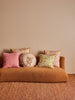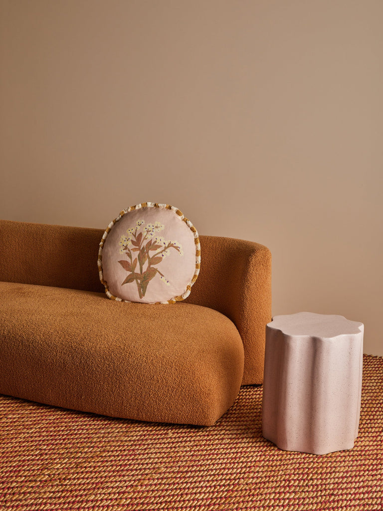 This round linen cushion is dotted with tiny Forget Me Not blooms in caramel, bringing a sentimental floral touch and earthy warmth to your home