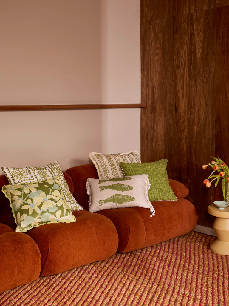 A vibrant cushion in an earthy green, bringing bold colour and rich knotted cotton texture to your space