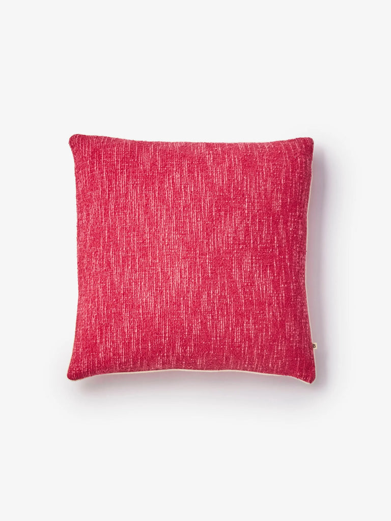 A vibrant cushion in a warm rose tone, bringing bold colour and rich knotted cotton texture to your space