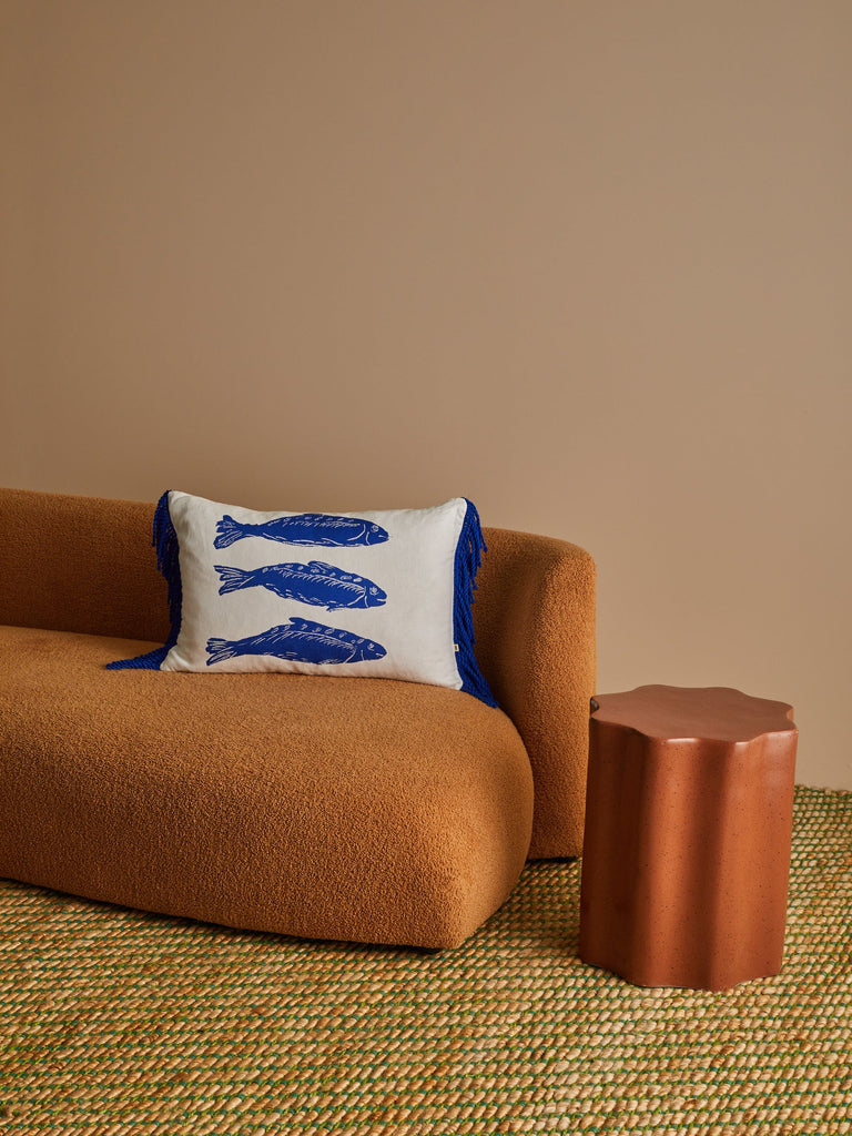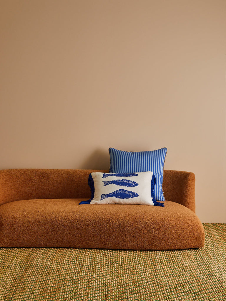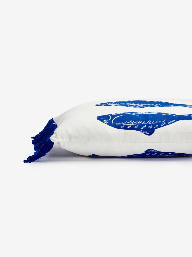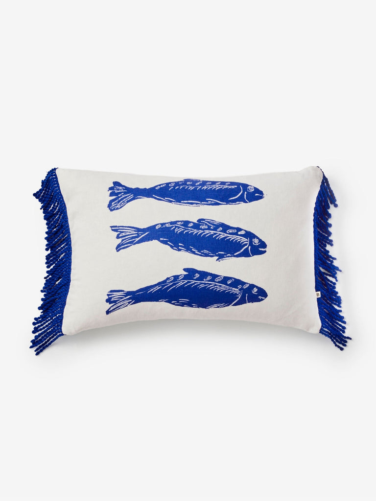 A playful linen cushion featuring hand-drawn blue sardines, finished with soft fringing