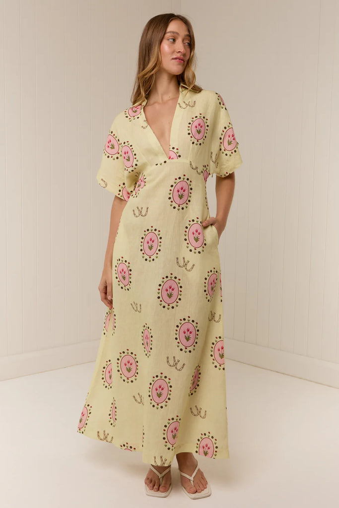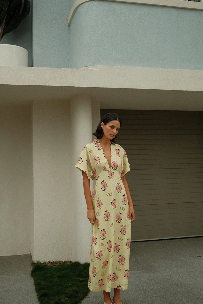 The Jasmine Dress is crafted from a Premium Linen, printed in our exclusive Savanna Tile print