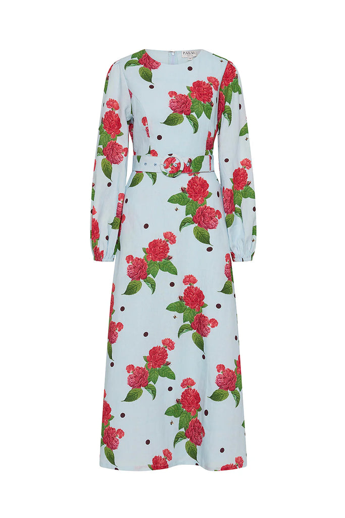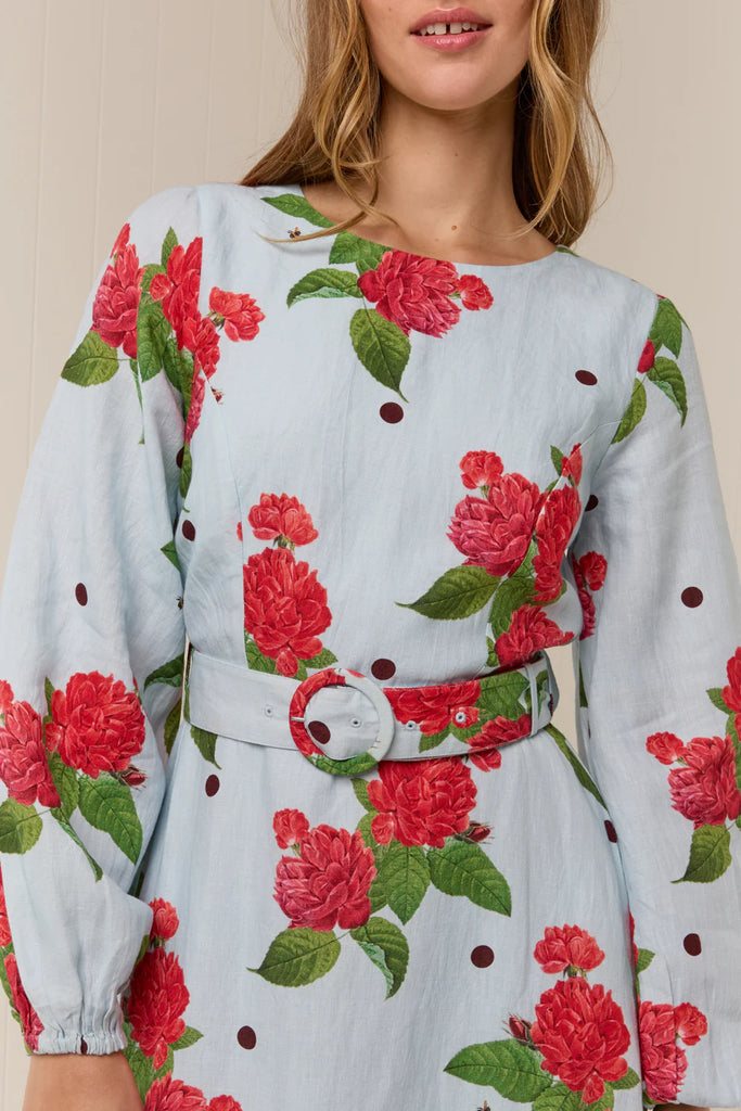 The Melrose Dress, printed in our exclusive Sky Garden print, is crafted from a premium Linen