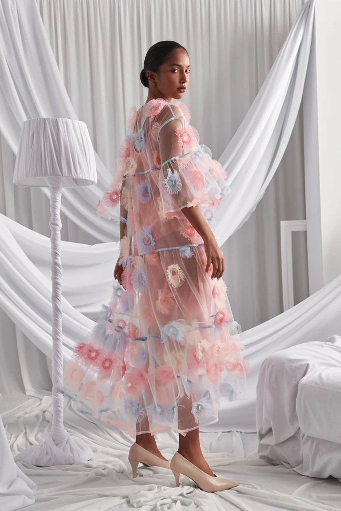The Radiance Dress lives up to its name with a sheer tulle silhouette illuminated by oversized 3D floral appliqués in soft pink and powder blue