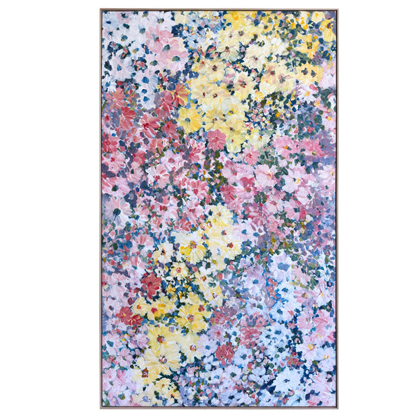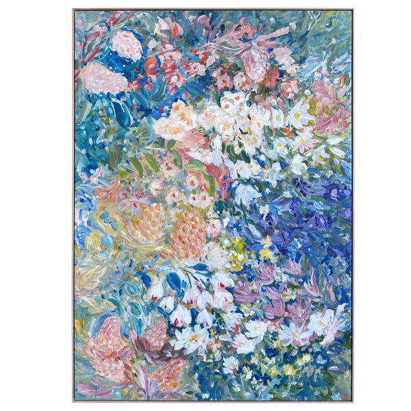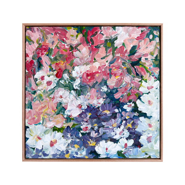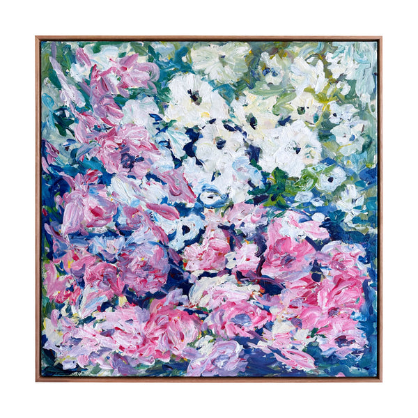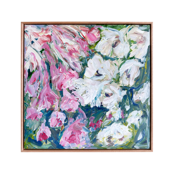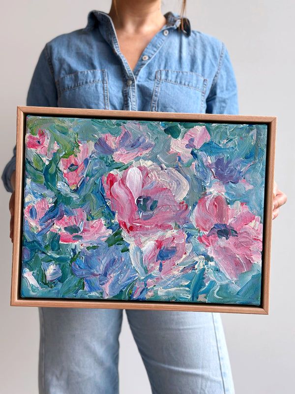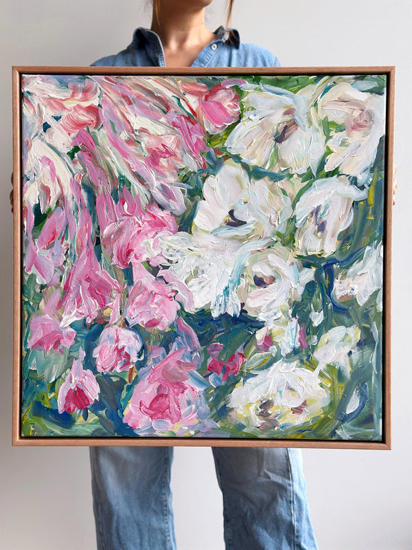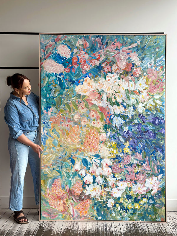I work intuitively, crafting the blooms in soft layers and letting colour lead the mood - from muted pastels that evoke tenderness and a soft unfolding to brighter hues that celebrate growth, vitality and light. The colours almost dance onto the canvas until they all find a happy balance. I like to let the painting evolve and be guided by the energy of the process.