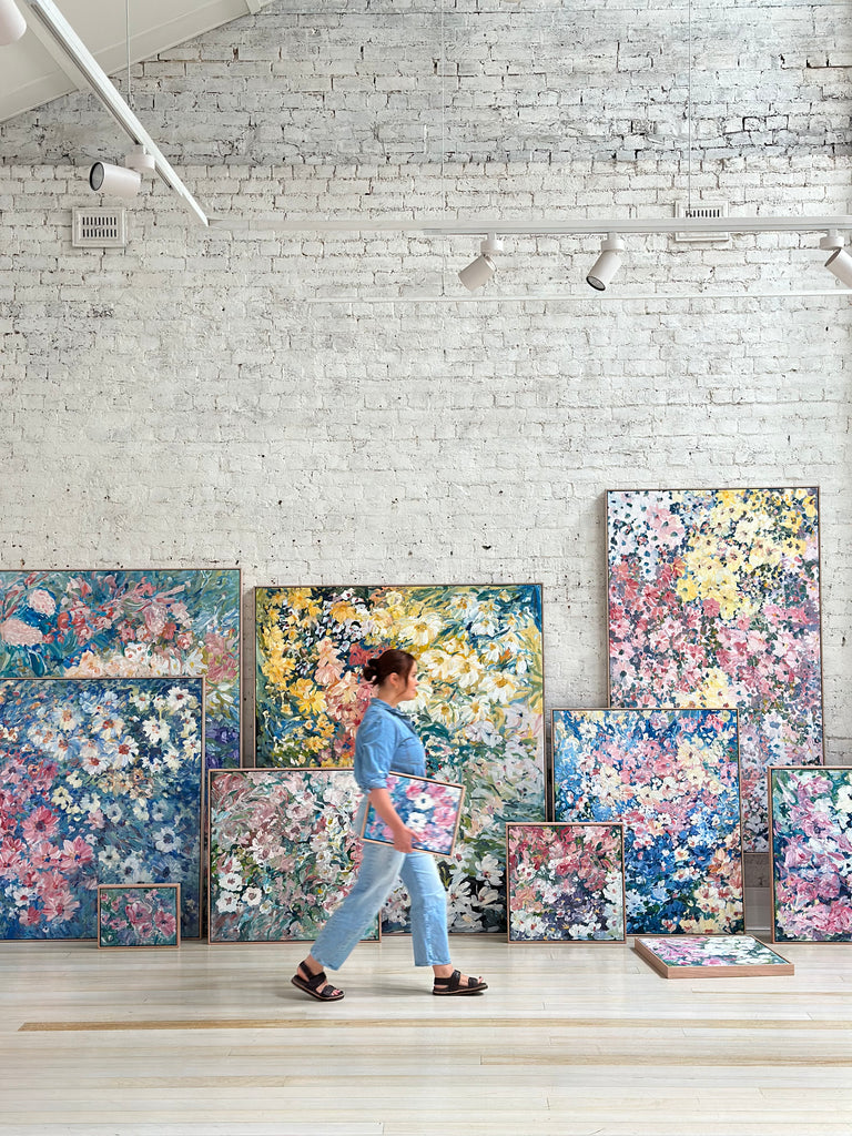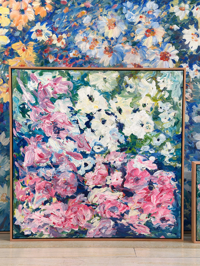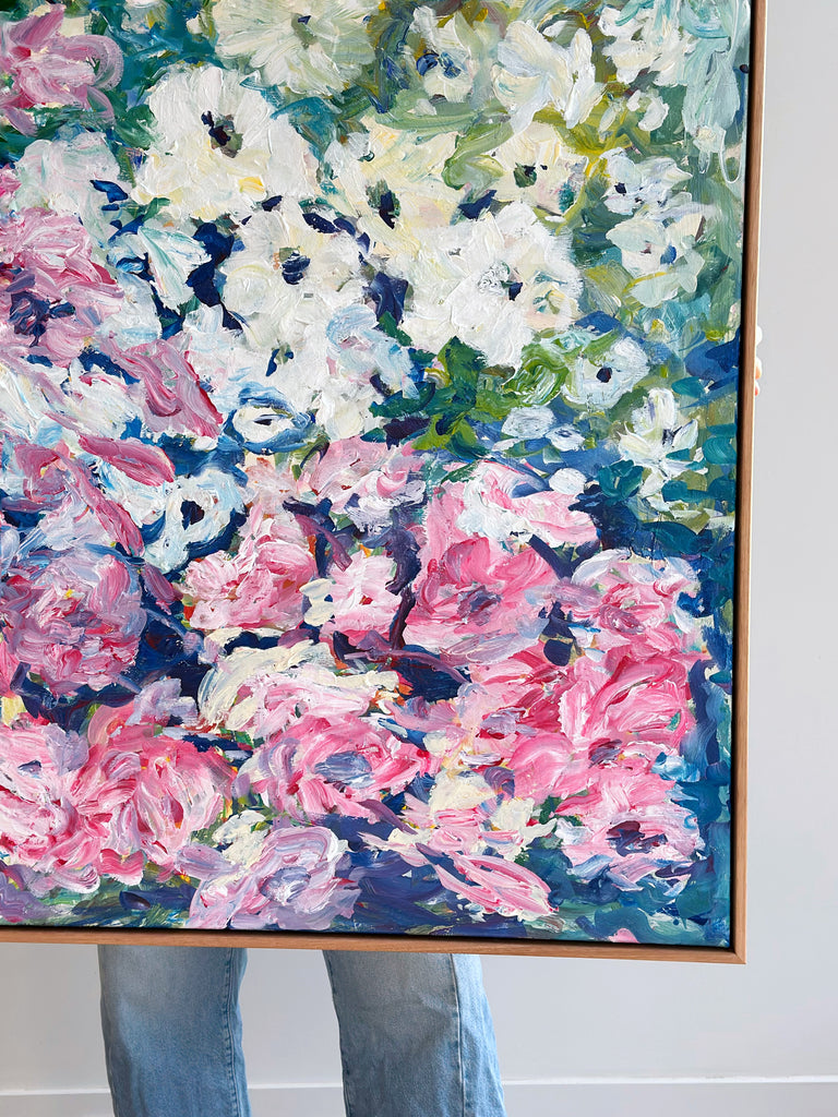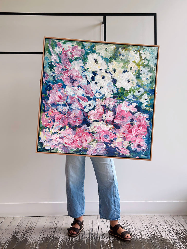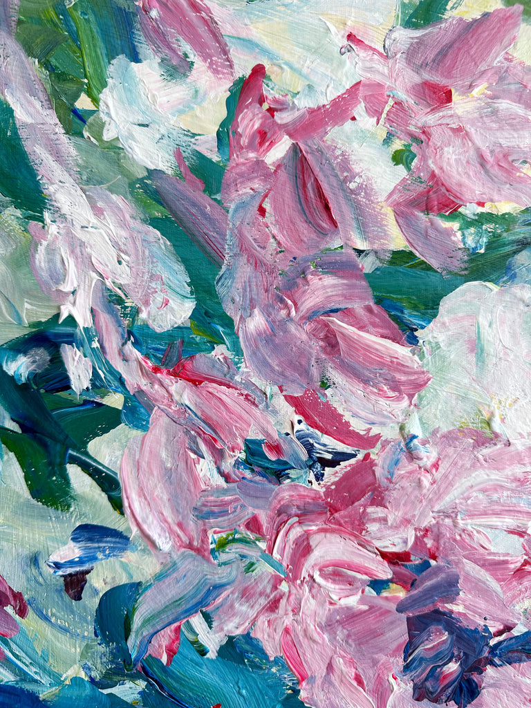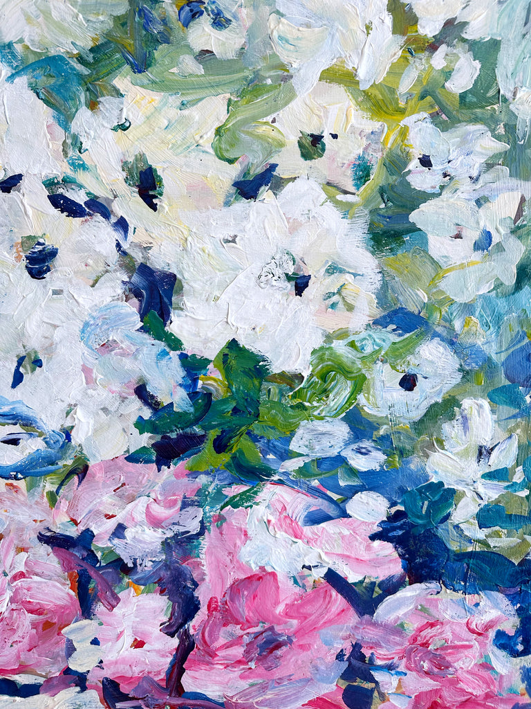 Held In Spring is inspired by the way the flowers begin to bloom as if supported by unseen hands! This painting honours the joy of spring flowers. Thick layers of eggshell whites and dusty pinks depict new growth wrapped in tenderness - Jude x
