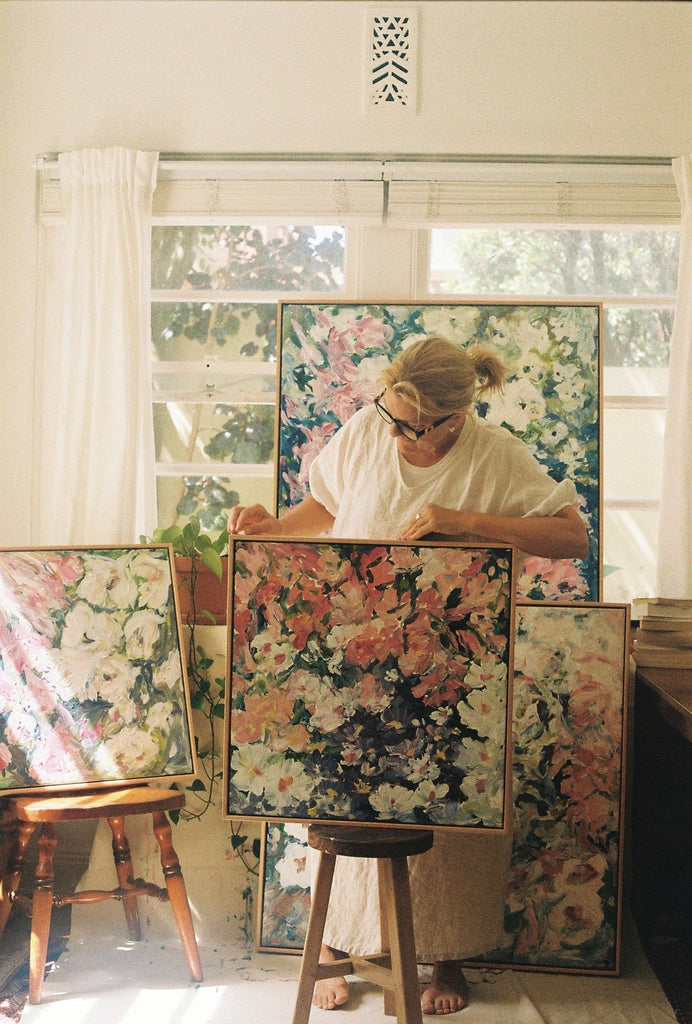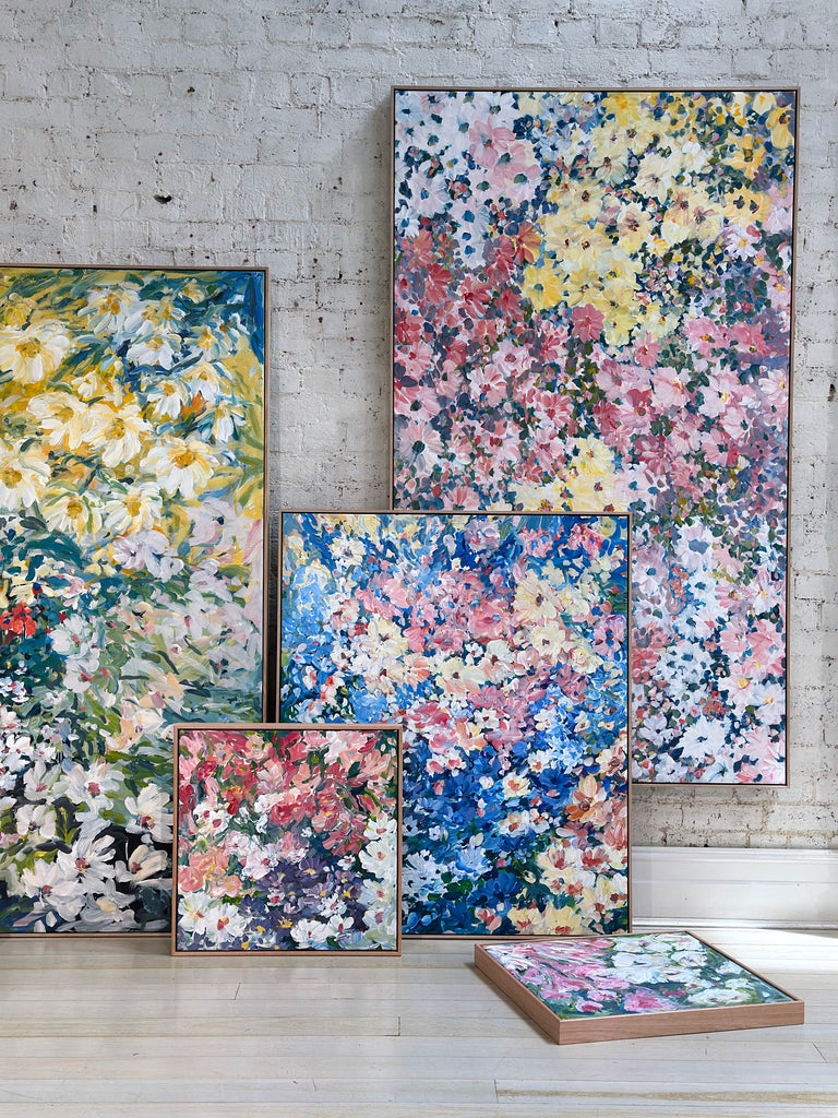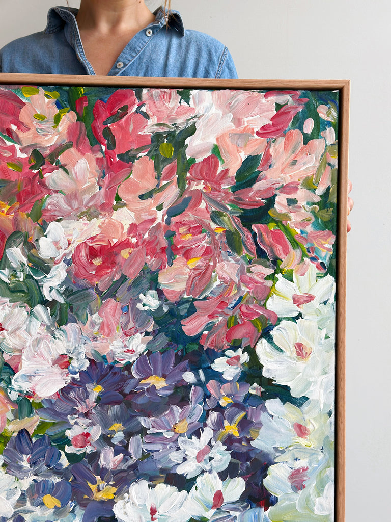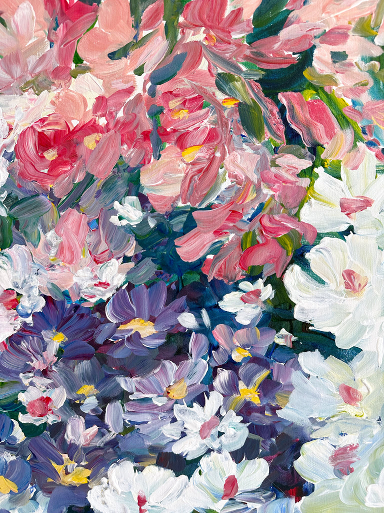 This painting is inspired by new buds quietly emerging in the spring garden. The colours are mixed directly onto the canvas to depict these beautiful floral gifts that have grown in the garden - Jude x