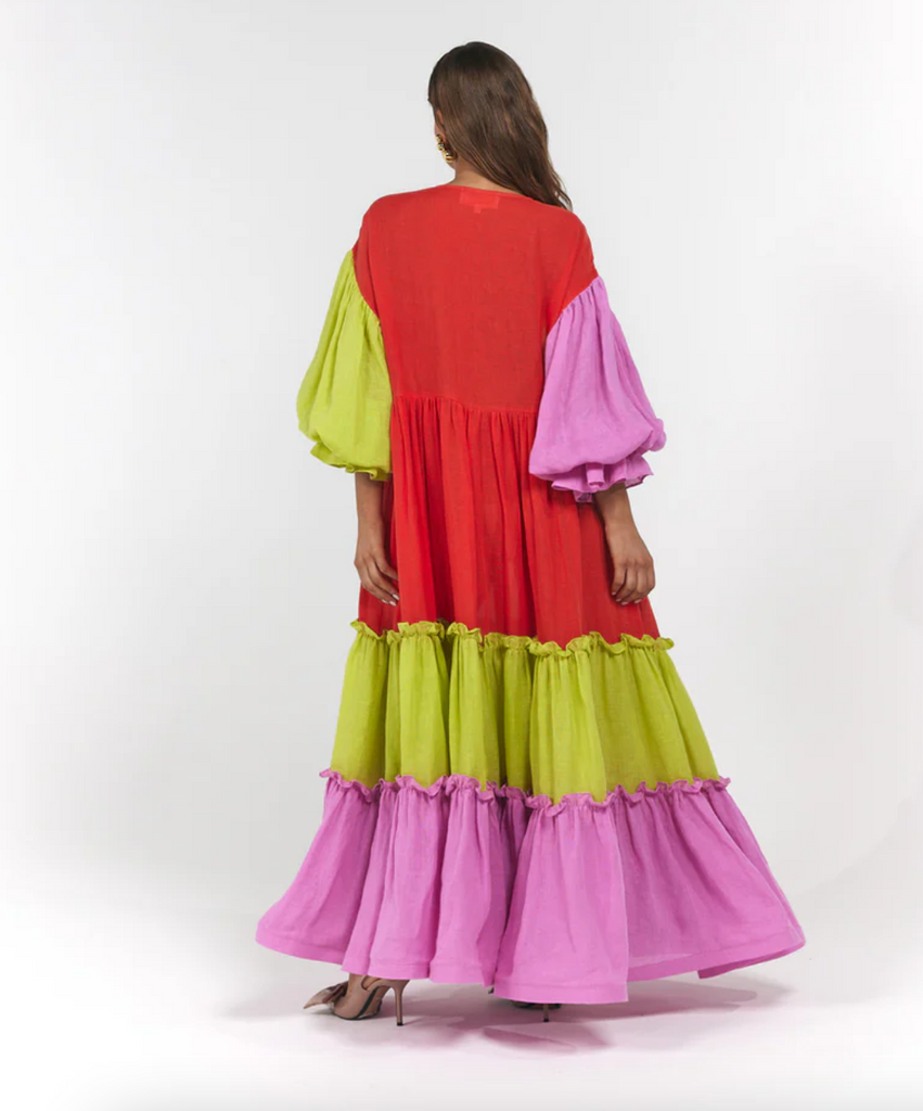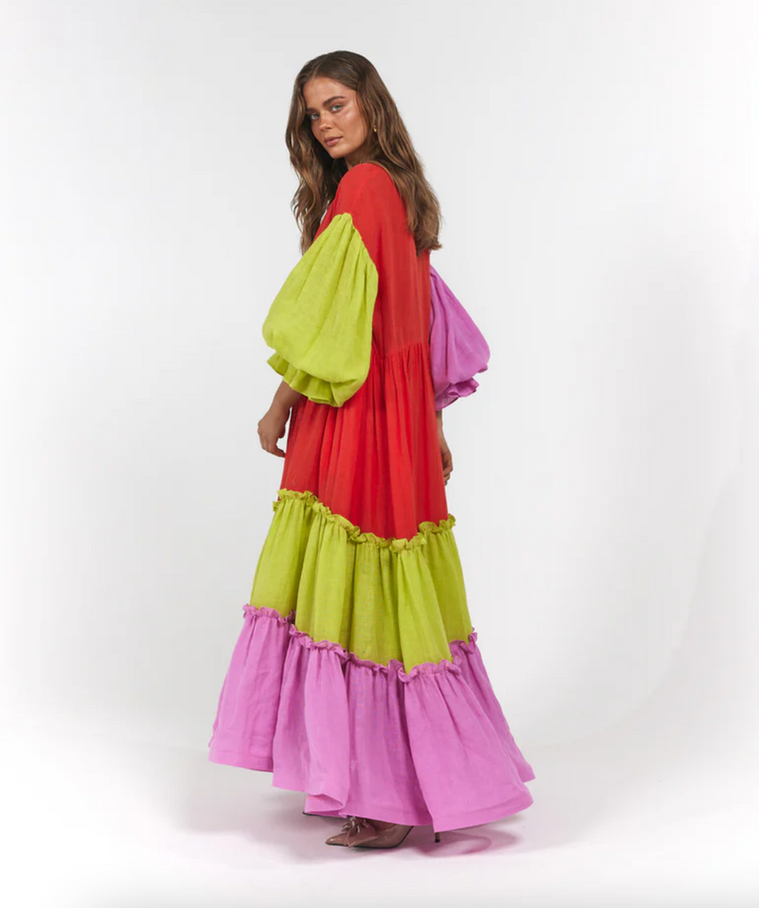 Featuring over six metres of pure linen, the new Leilani Maxi showcases an effortlessly elegant structure—defined by an oversized flared cuff, cascading double-tiered ruffles, and delicate mother-of-pearl buttons