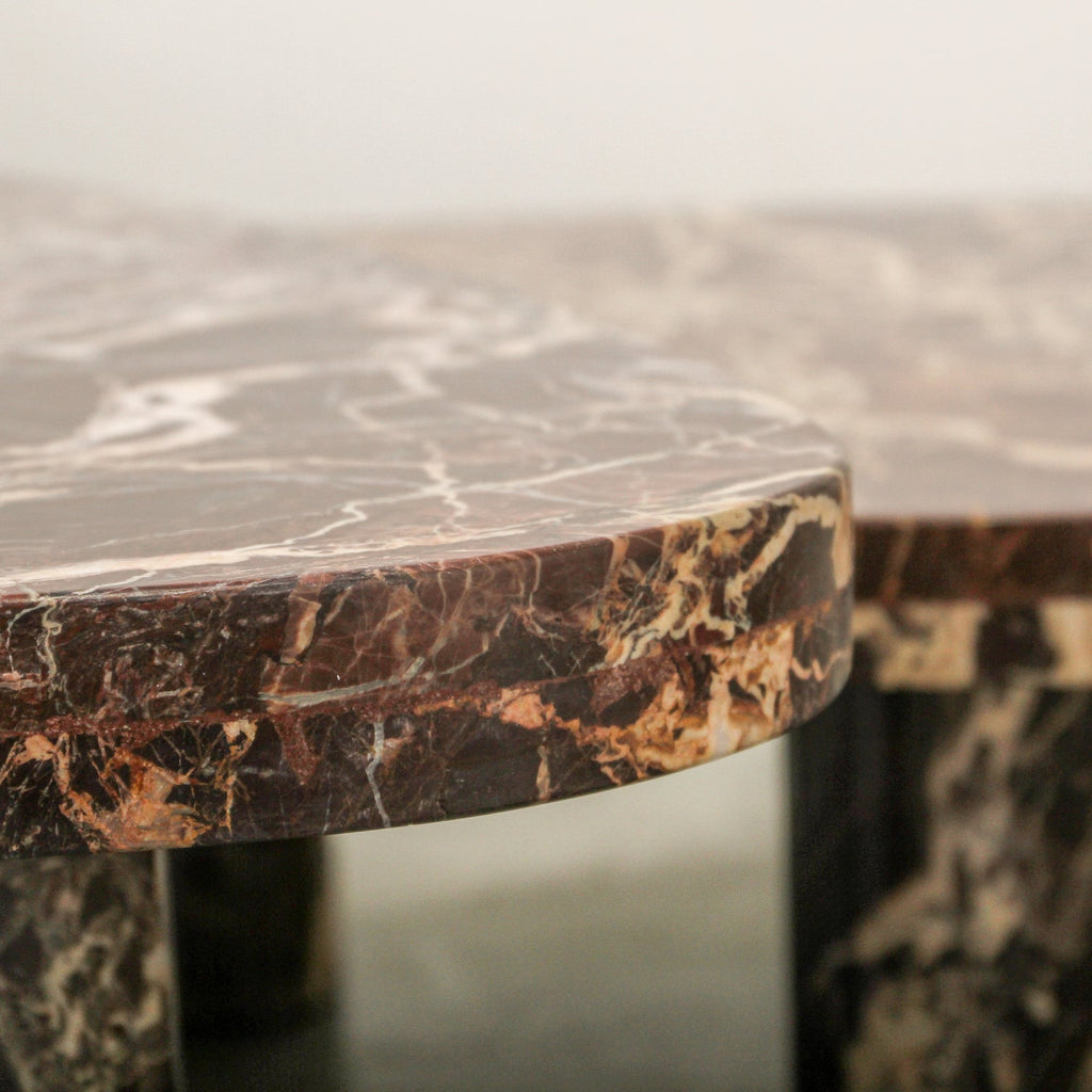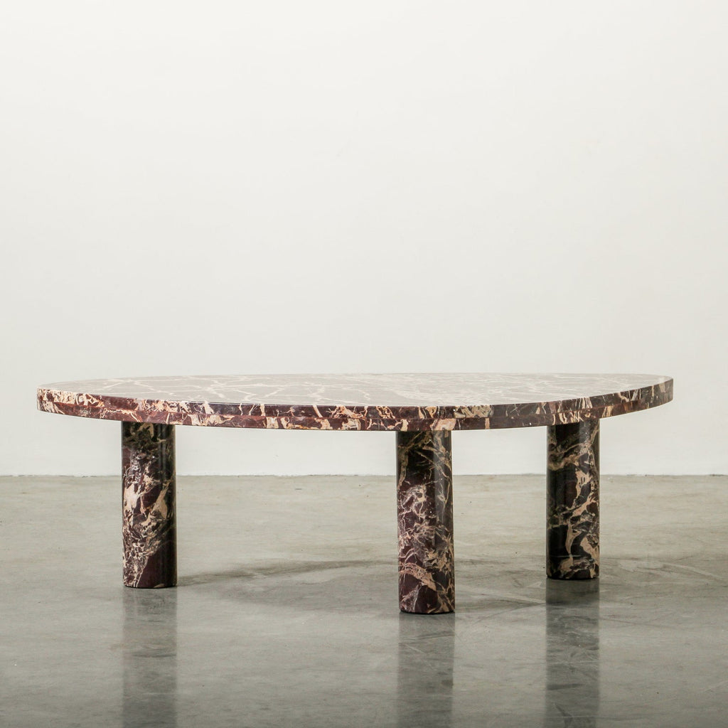 Crafted entirely from Cherry marble, this table blends deep burgundy tones and subtle veining with a softly contoured silhouette
