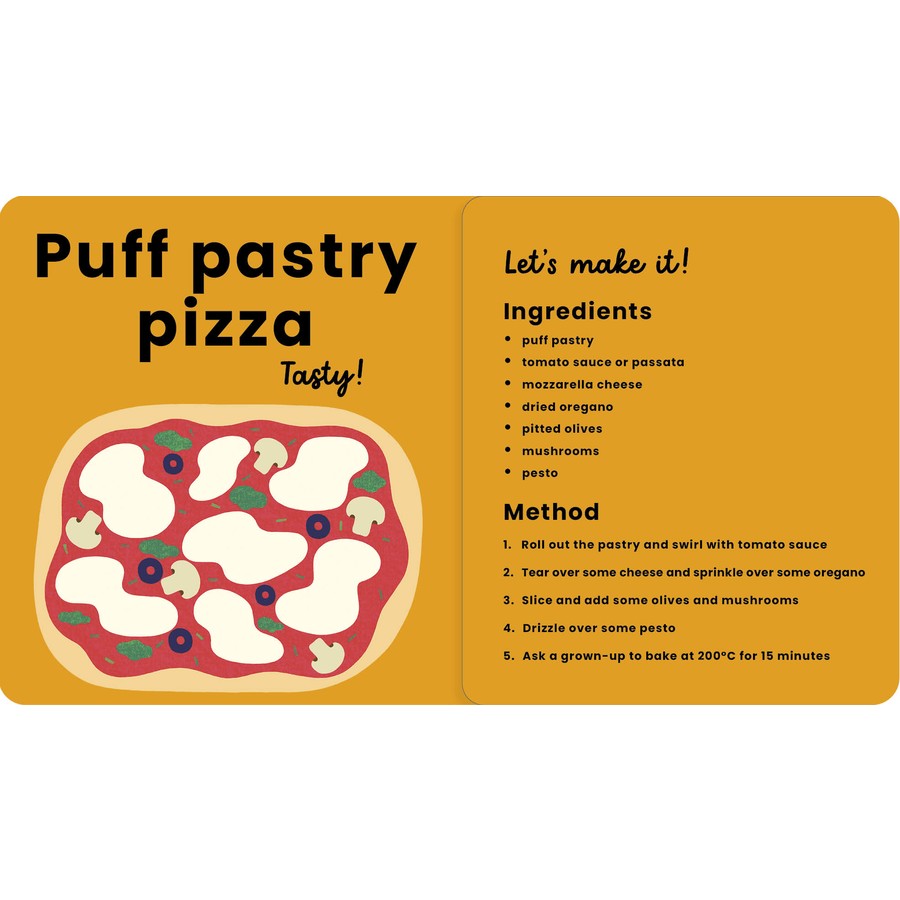 Then, lift the flap to follow the action: swirl the tomato sauce, sprinkle the cheese . . . and in five simple steps you'll have made pizza. Tasty!