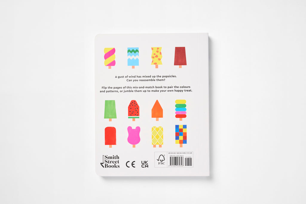 Slurp is a mix-and-match book that invites you to flip through its split pages to reassemble the popsicles by matching the patterns or create brand new ones by mixing it up