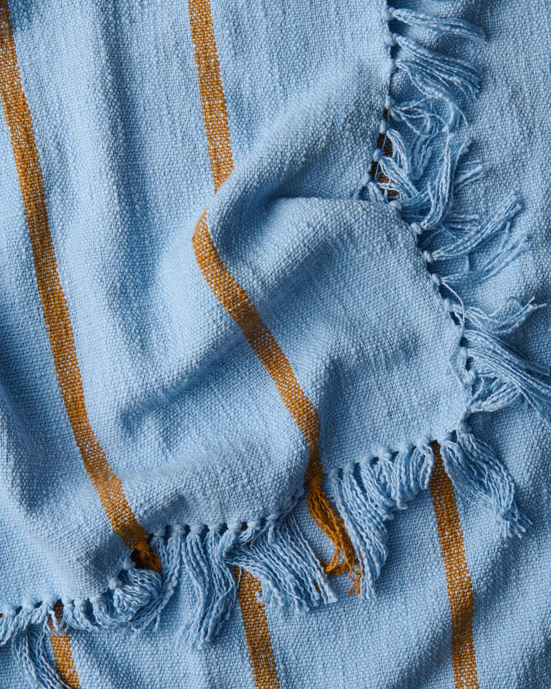 Made from 100% cotton with a calming blue and brown vertical stripe, the tactile weave and natural finish bring depth and warmth to any space