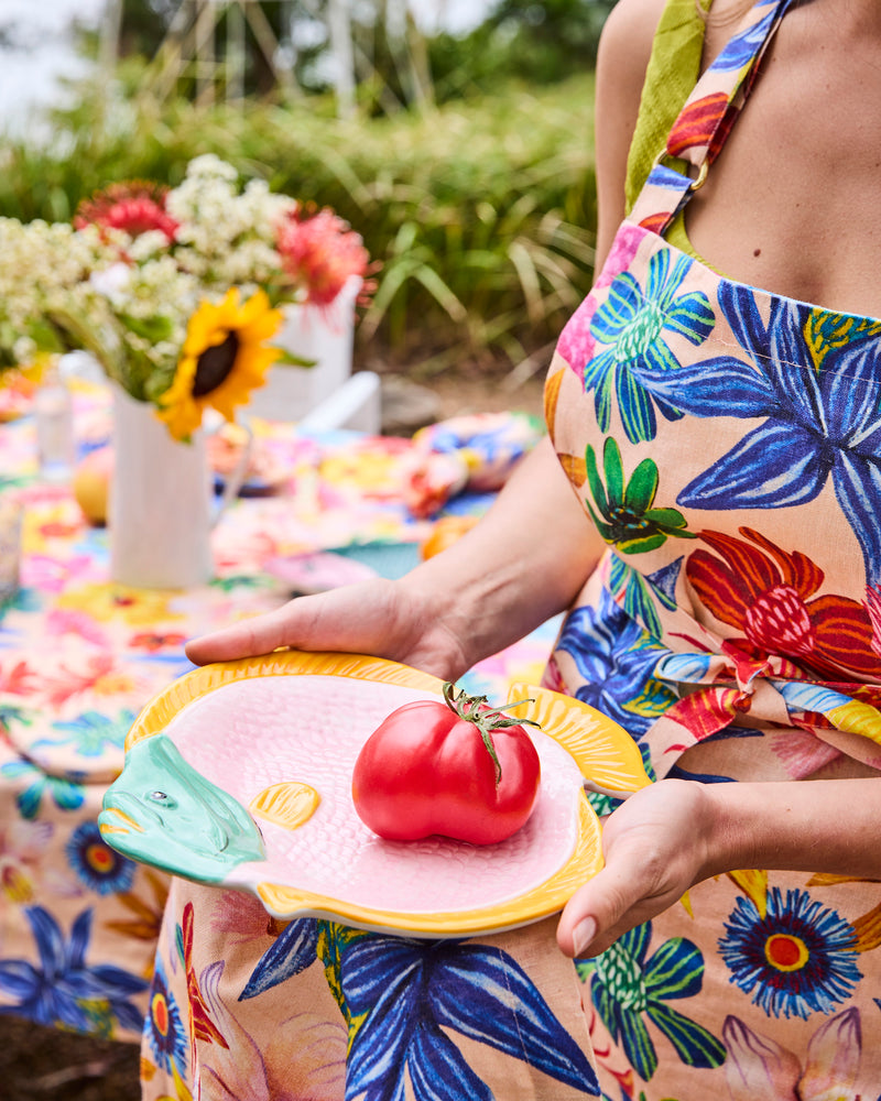 The Coral Bay Fish Serving Dish, in soft pink with a bold green face and sunny saffron fins, is ready to plate up prawns, tropical fruit, or any summery spread