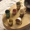 Handmade and glazed in a reactive glaze in different colours and gilded with gold around the rim and the handle