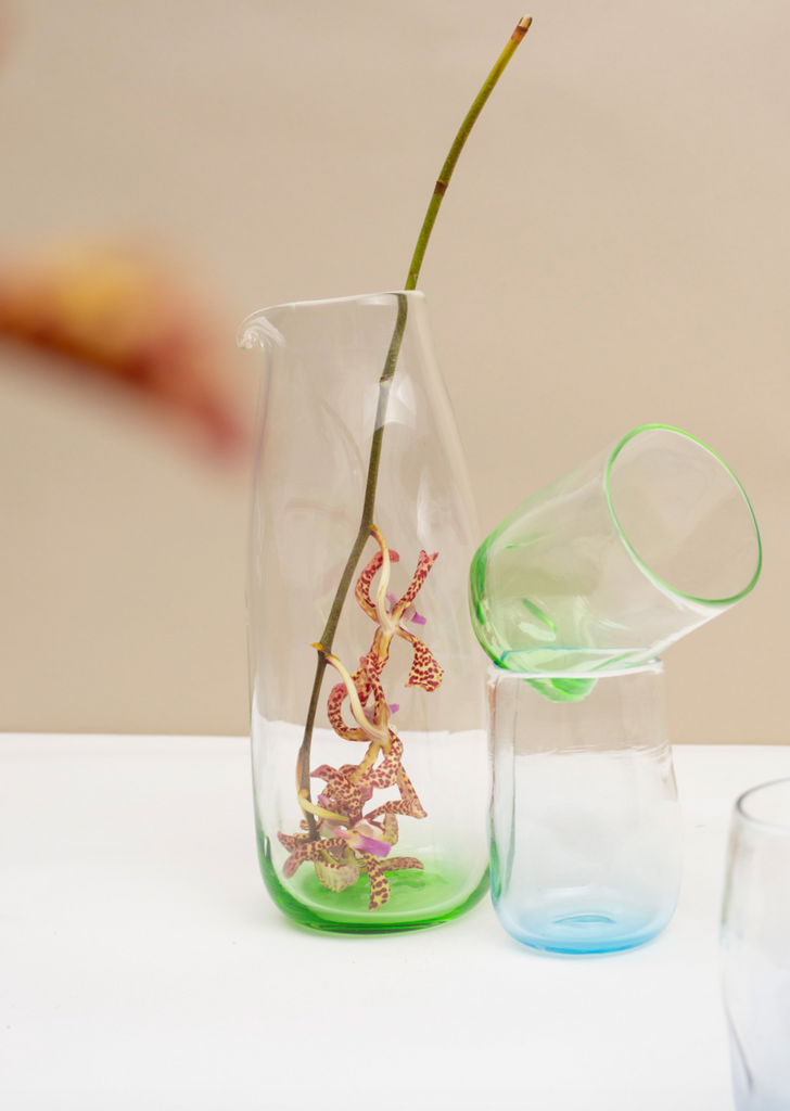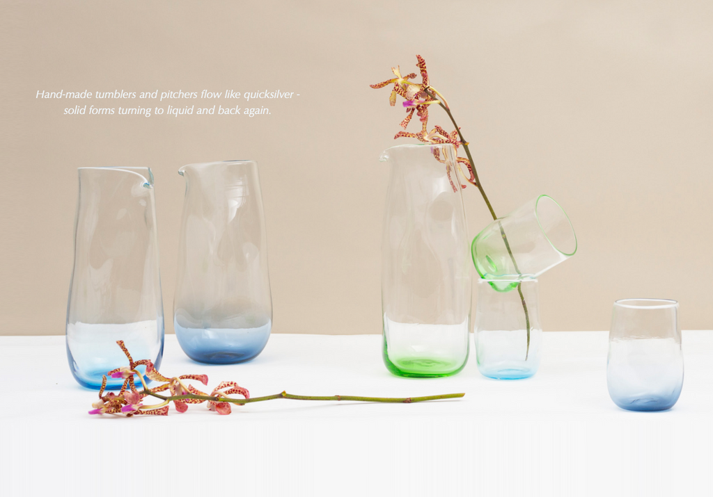 These hand-made tumblers and pitchers flow like quicksilver- solid forms turning to liquid and back again. Their fluid design captures the light and reflects a unique gradient, their shape appearing to change like the ebb and flow of moving water.