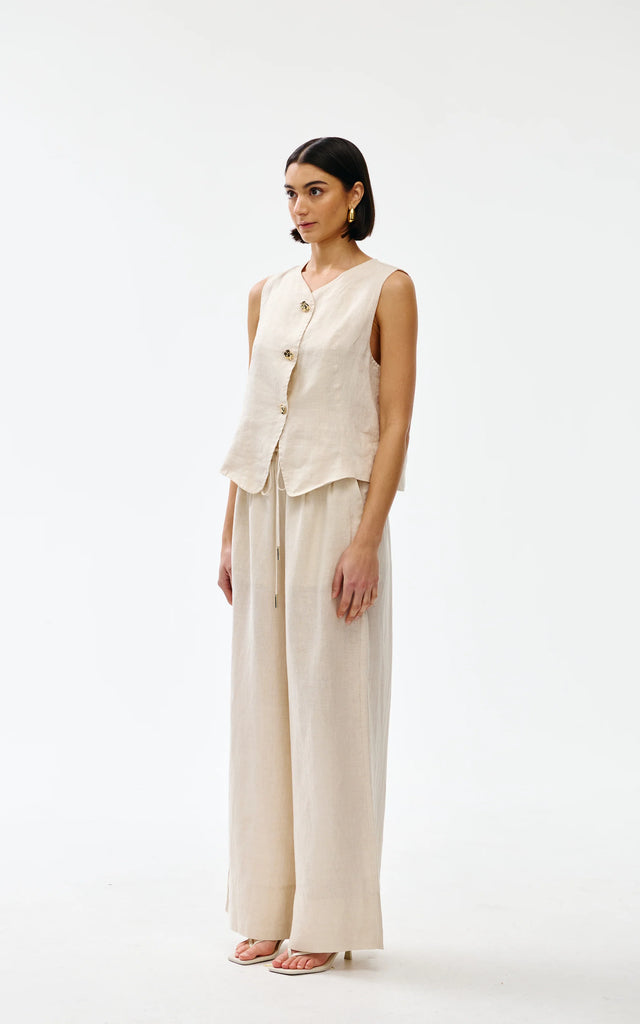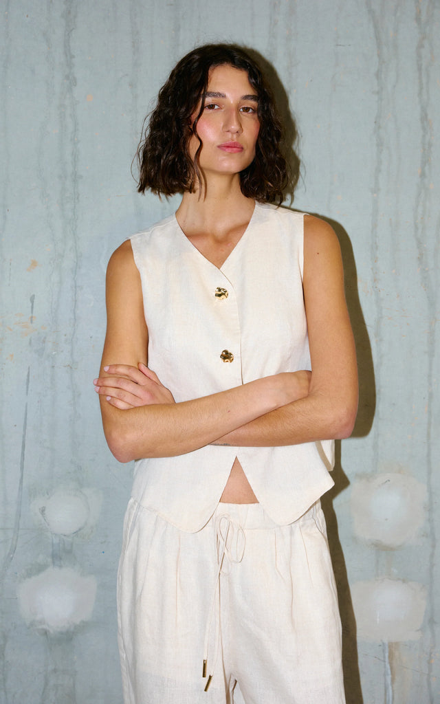 Crafted from soft, breathable linen, this sleeveless design features an elegant V-neckline and button front with distinctive gold-toned hardware