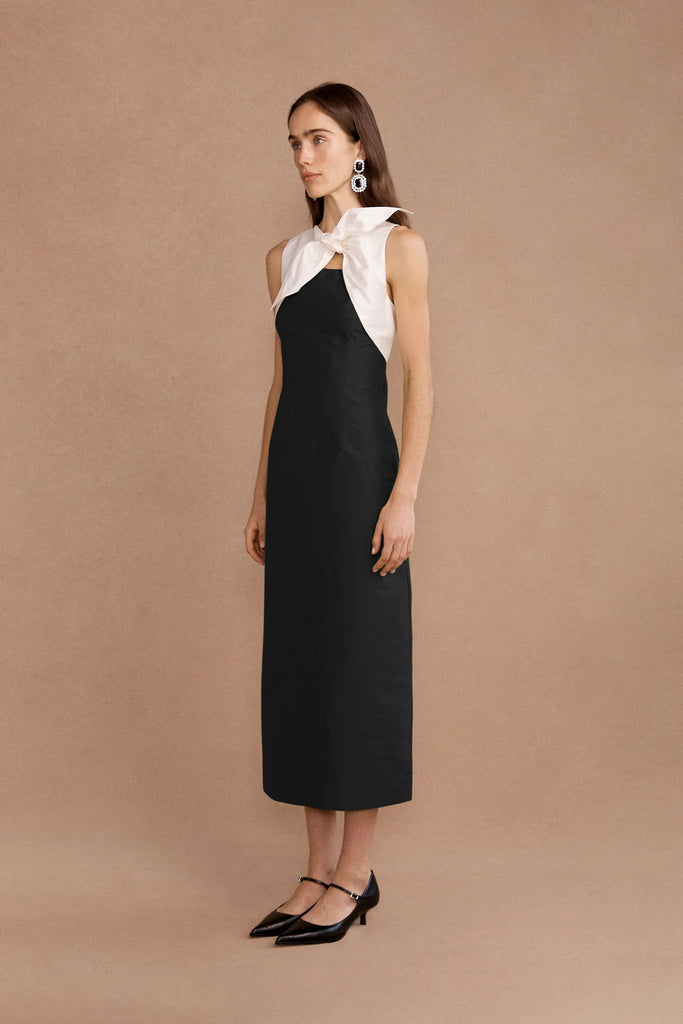 The Charlotte midi dress in black is an elegant silhouette elevated with a statement bow detail at the neckline