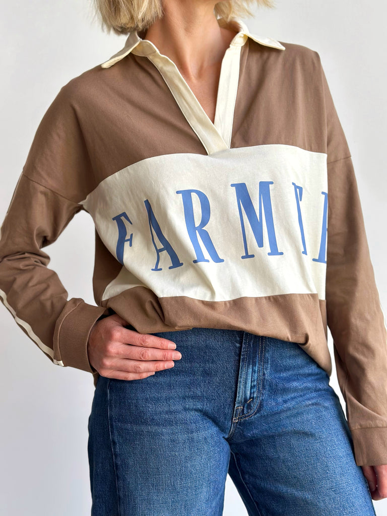 Rendered in a warm cinnamon hue, the pullover features an ecru front panel with contrast detailing and a matching ecru printed stripe running down the sleeve