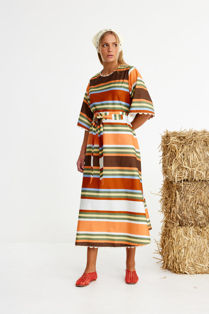 Crispiest 100% cotton poplin, this maxi shift dress combines bold, beachside stripes with ye olde Binny favourite ric rac trim