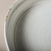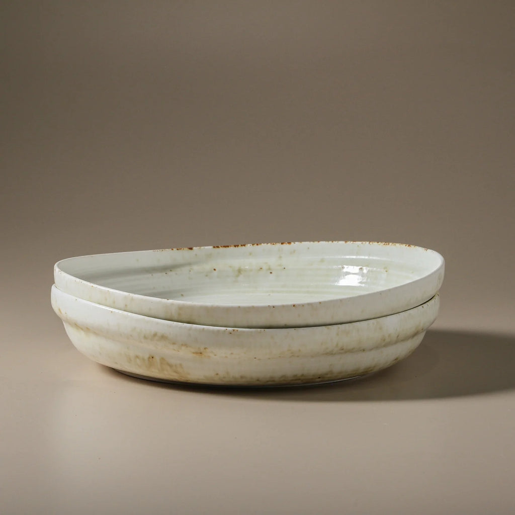 Its gently curved edges and off-white porcelain base are enhanced by a reactive glaze, creating subtle speckles and a rustic bronze patina