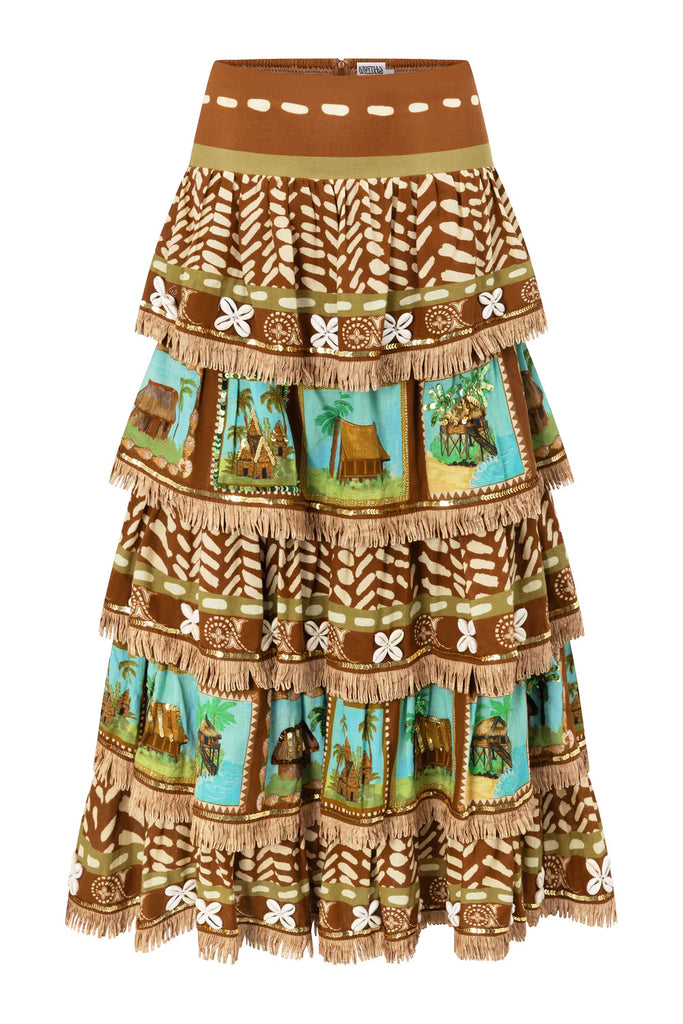 Designed to complement the Canopy Hut Shirt, this statement piece features tiers of hand-embellished seashells, shimmering sequins, and raffia trims that dance with every step - evoking the rhythm of island life and the textures of the tropics