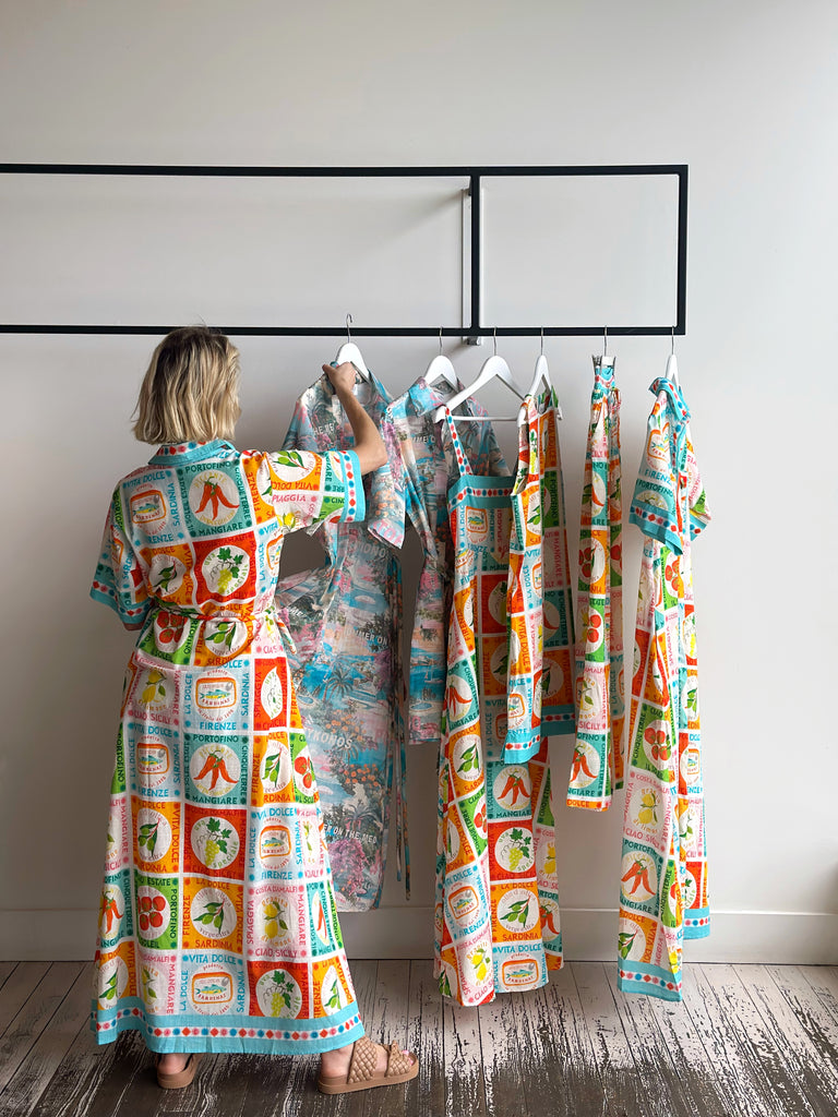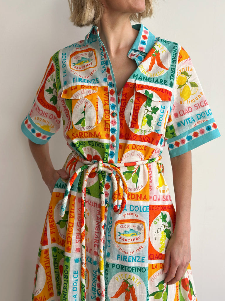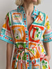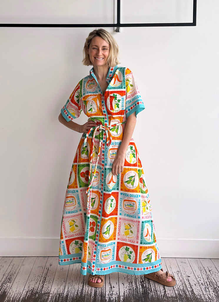 Featuring an all-over nostalgic Italian print with vibrant motifs and sun-soaked colours, this button-up midi dress is both bold and breezy