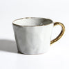 Handmade and glazed in a reactive glaze in different colours and gilded with gold around the rim and the handle