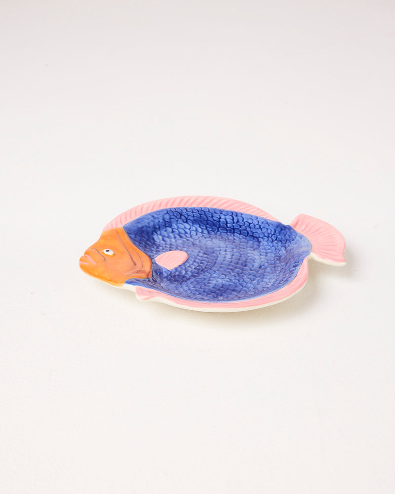Our Bermuda Fish Serving Dish is a round ceramic beauty, hand-painted in ocean blue with a zesty orange face and playful pink fins