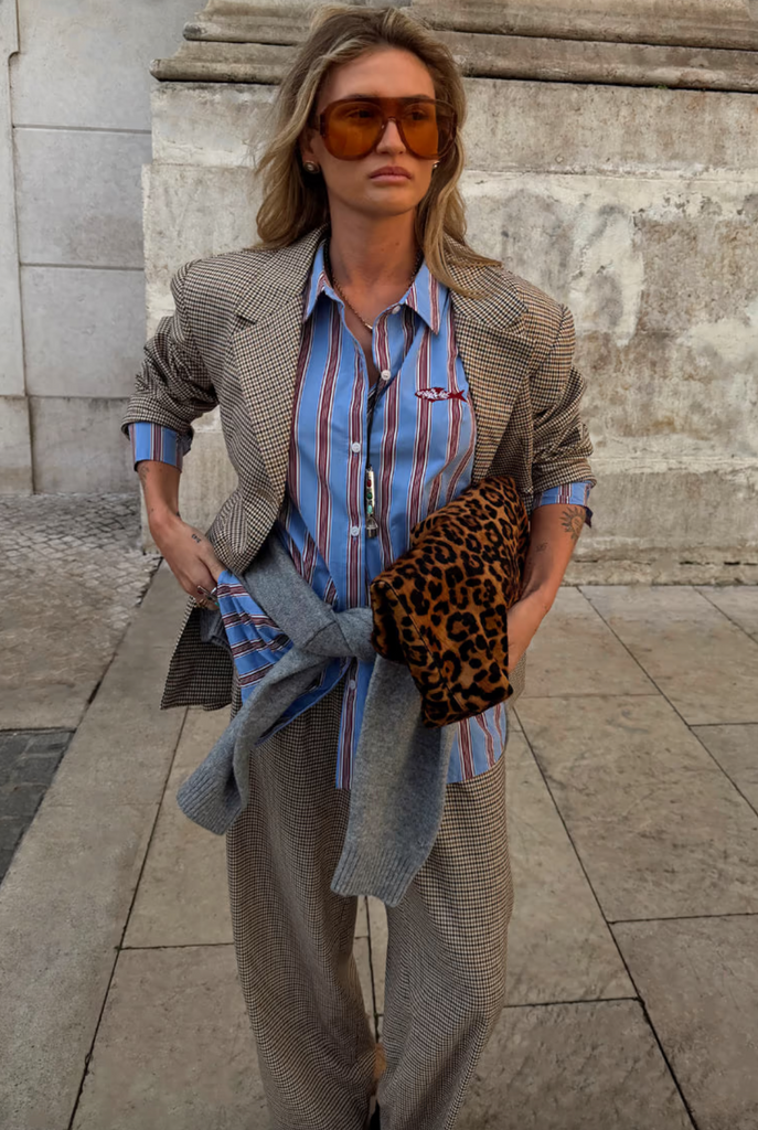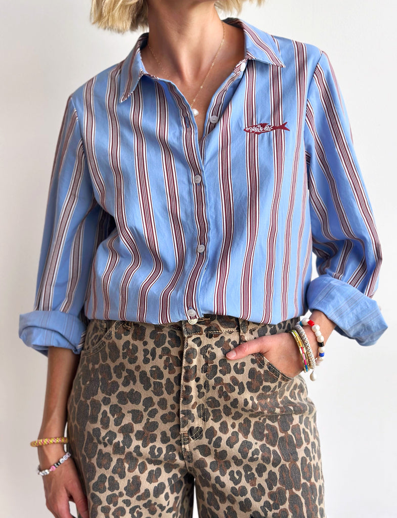A classic blue shirt with a red pinstripe print in a structured silhouette, that's perfect for dressing up or down