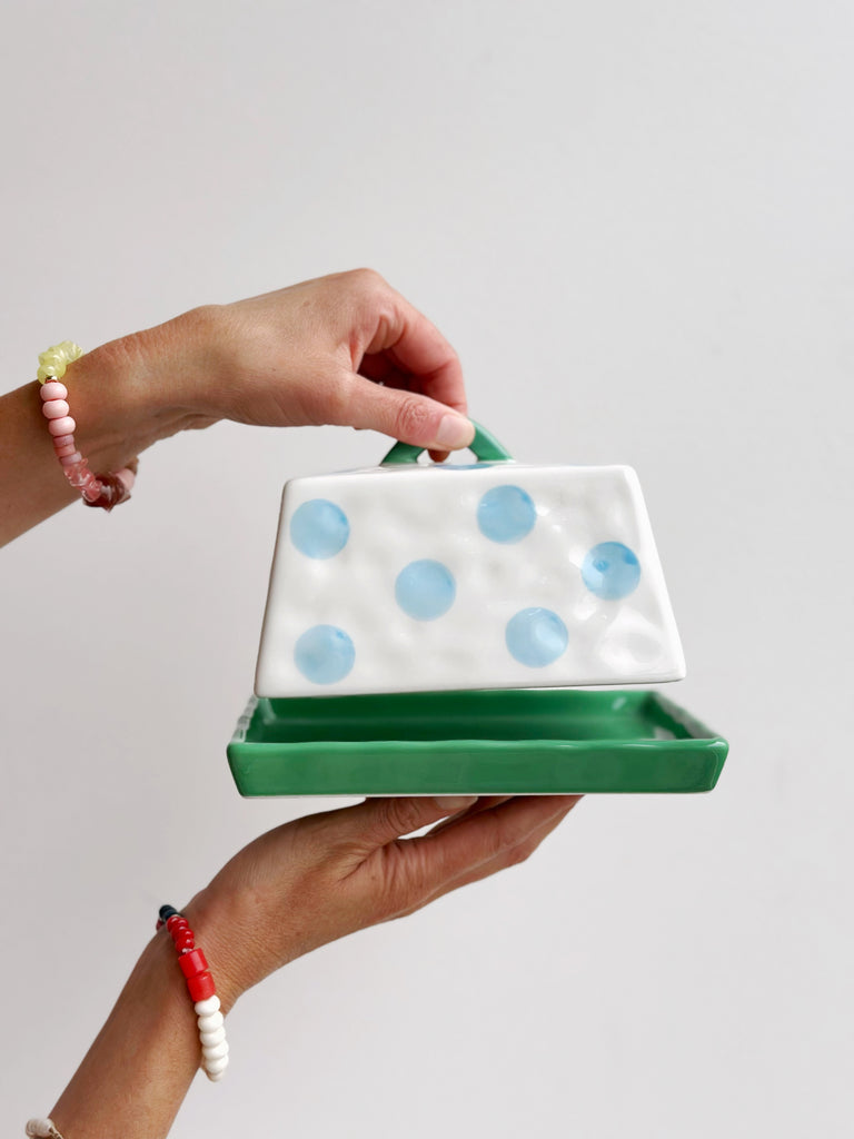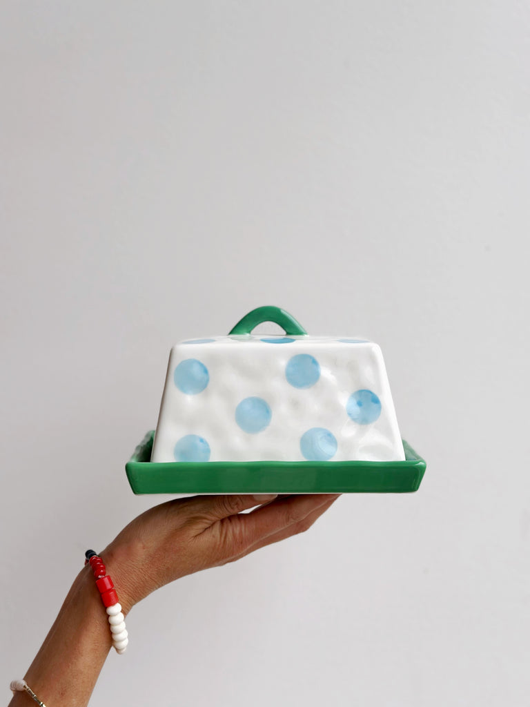 Butter Dish - Blue Dots with Green
