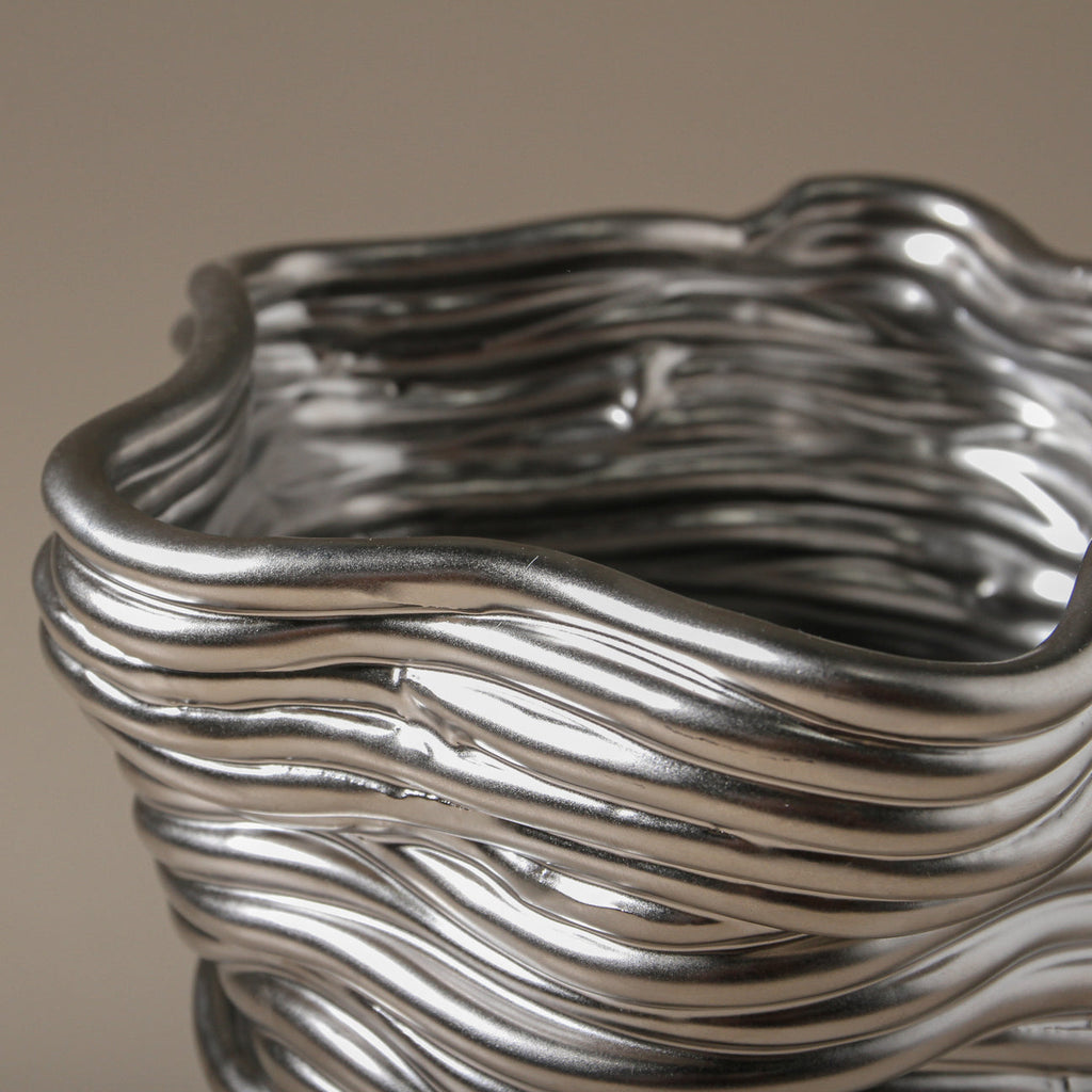 With its wavy, reeded contours and fluid design, the Cascade Vase in a nickel finish captures the essence of flowing water