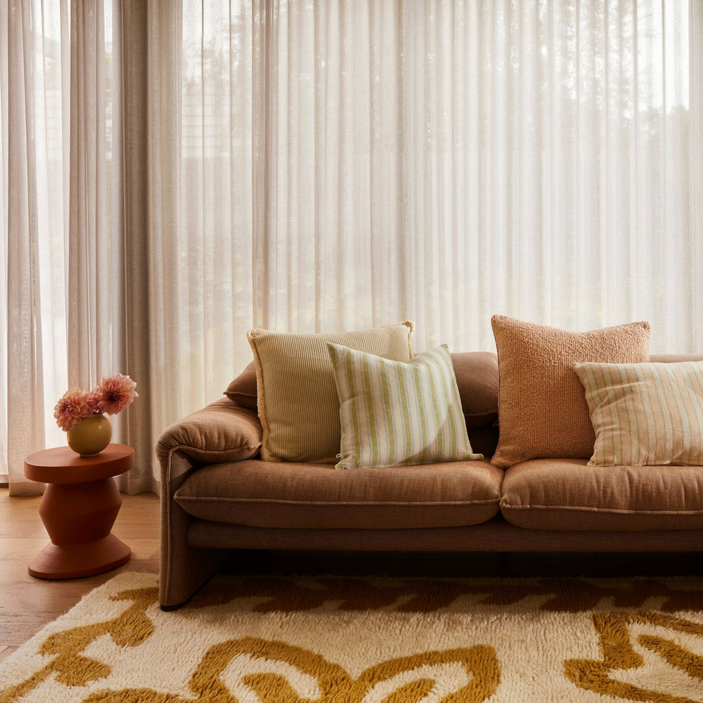 Completed with a subtle cream cord piping trim, this cushion is the perfect match for bold magenta stripes and soft pink florals