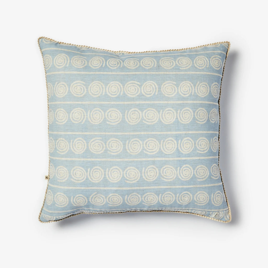 With its harmonious blend of organic and structured elements, this light blue coastal cushion styles beautifully with bold stripes and textured cushions