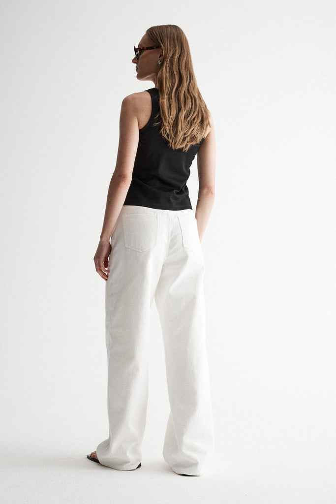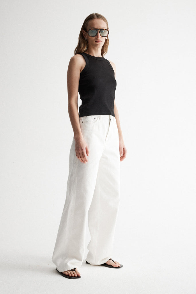 The wide self-bind finishing on the neckline and arm holes sets it apart with an elevated look ideal for pairing with jeans and suiting options