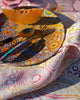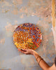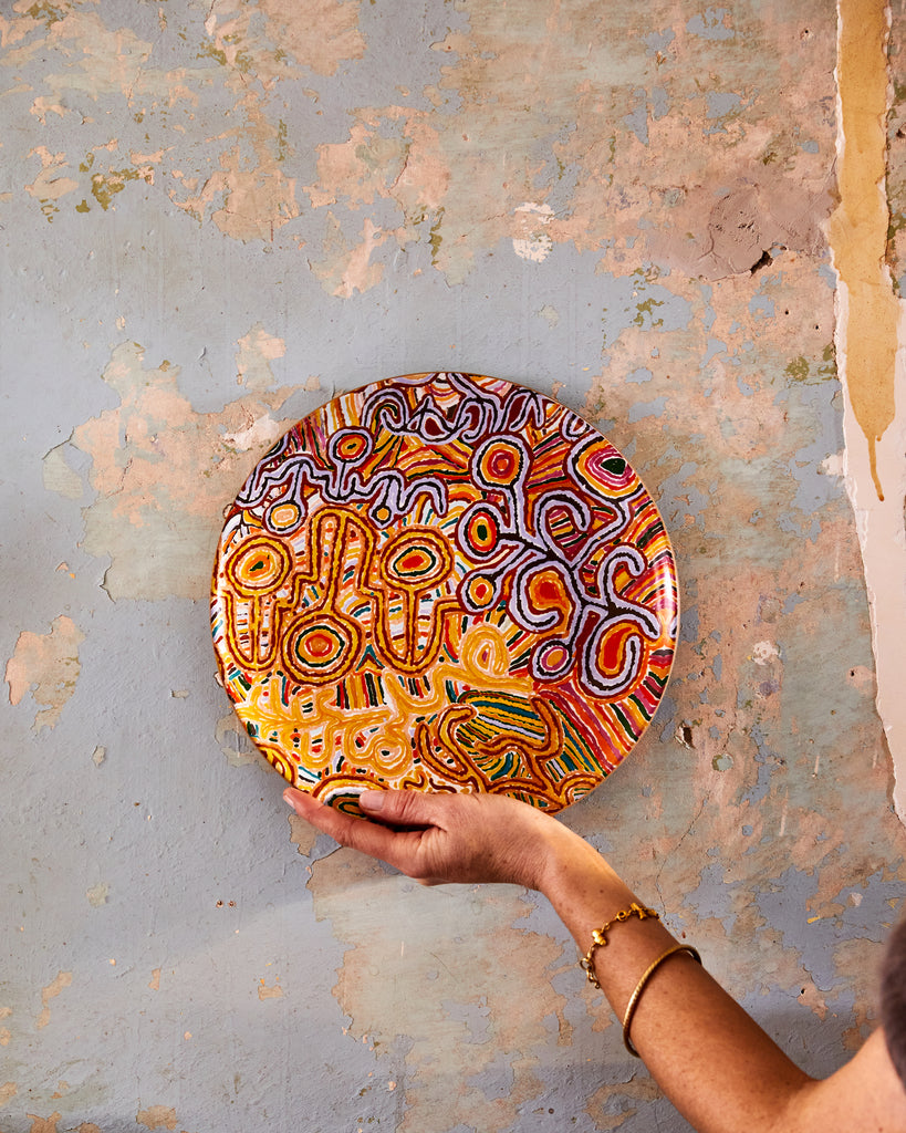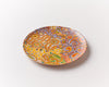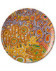 The Ngayuku Ngura Ceramic Dining Plate 2P Set features intricate patterns in tones of orange, purple, brown and green