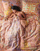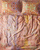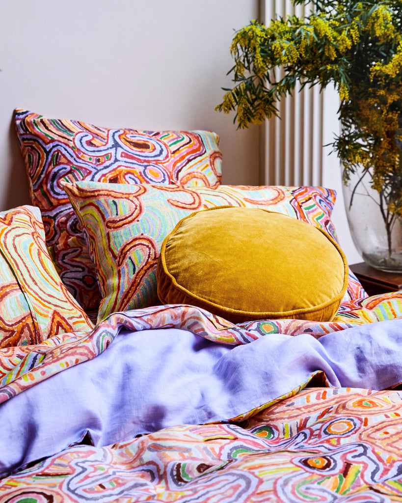 The Ngayuku Ngura Linen Quilt Cover is made from 100% French flax linen and features intricate patterns in tones of orange, purple, brown and green and has a plain purple reverse