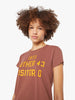Made from 100% supima cotton in faded brown, the tee features a scoreboard-inspired text graphic in yellow on the front