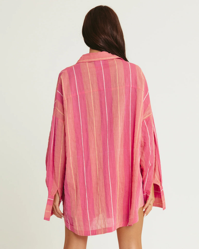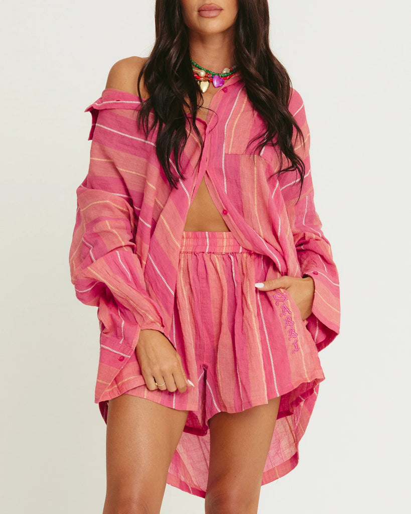 The Don Julio Shirt in peach and pink is sunshine, cocktails and carefree energy wrapped into one mega-cute oversized button-up.