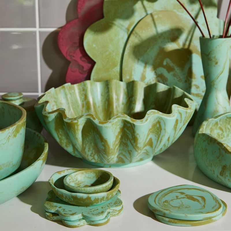 “Whether you’re entertaining or just enjoying daily dinners with the family, our resin tableware makes every meal an experience to remember. The Venus Bowl makes for the perfect elevated fruit bowl or a show-stopping centrepiece at dinner parties, particularly when filled with a delicious salad and paired with our Wilkie Servers. Reimagined here in our stunning Artichoke colourway – swirling together cool mint and olive green shades for a refreshing finish.” – Phoebe’s Style Notes