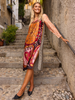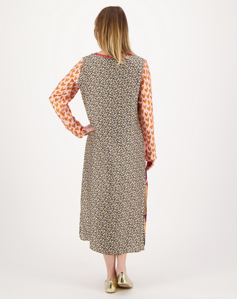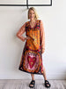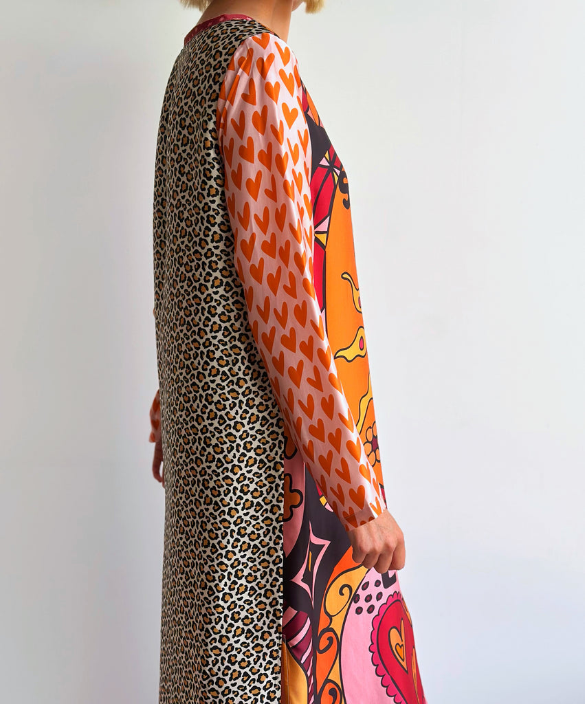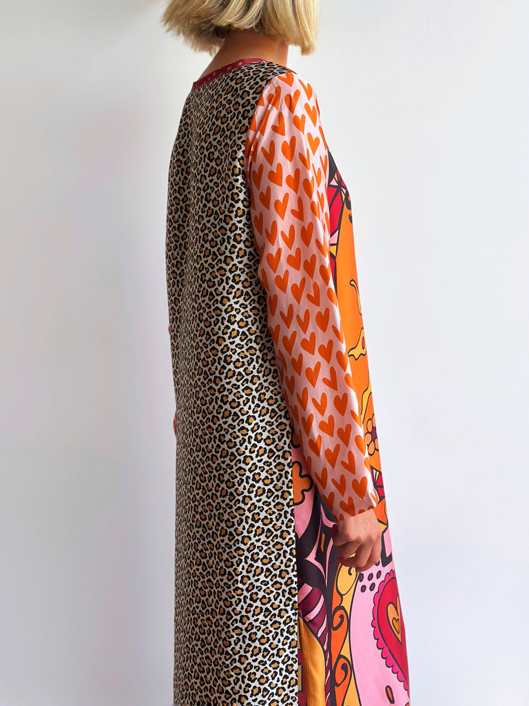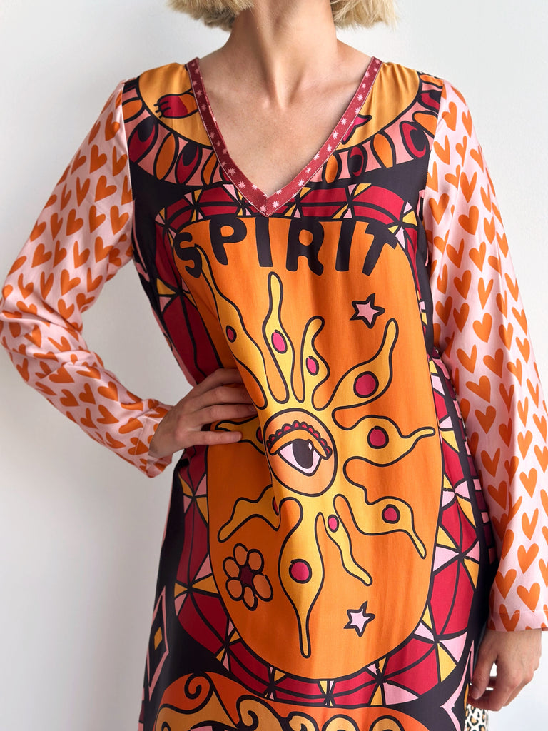 Long sleeve super vibrant long V-neck dress with side slits in our Sunset print