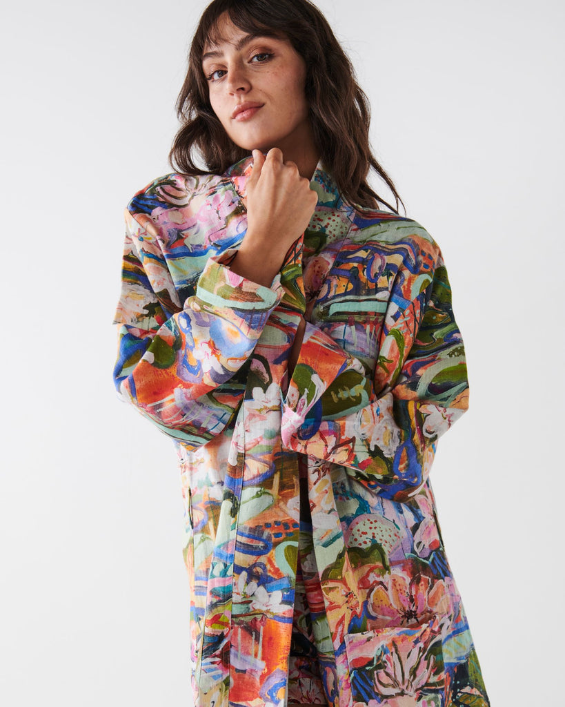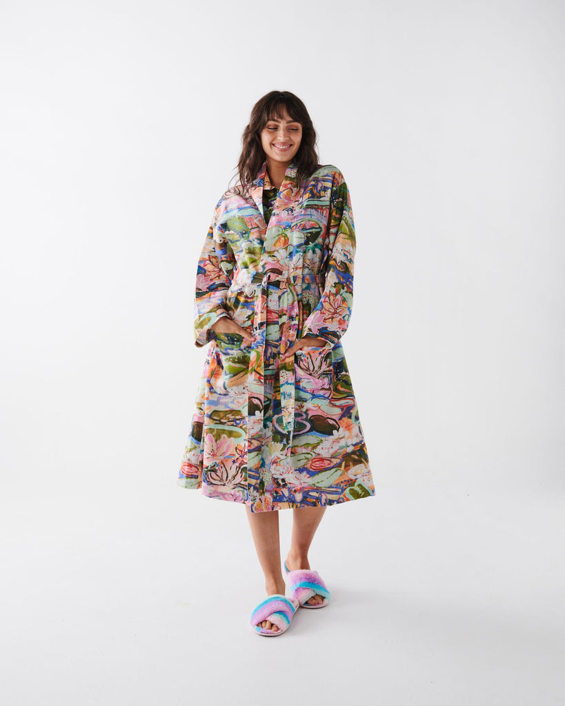 The Waterlily Waterway Linen Robe is part of a special collaboration between Kip and Co and Kezz Brett