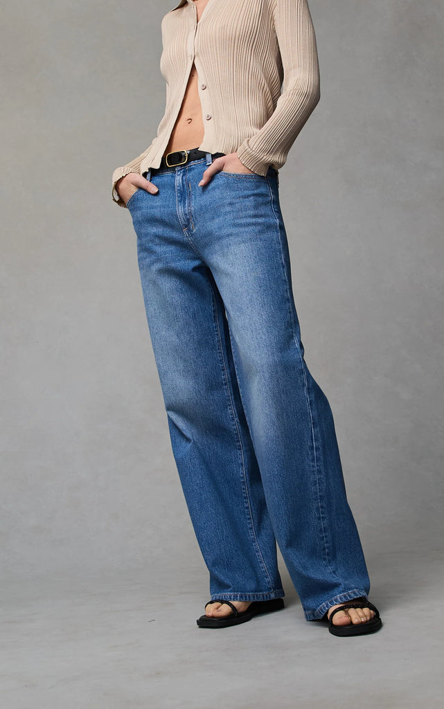 Crafted from durable denim in a vintage-inspired Rodeo Blue wash, they sit mid-to-high on the waist and fall into a wide, loose leg that grazes the floor